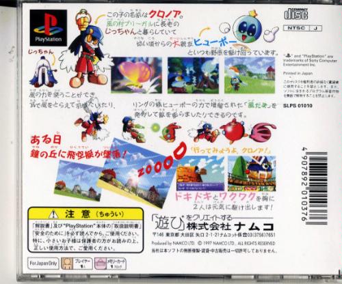 風のクロノア door to phantomile(ドア トゥ ファントマイル)は、1997年12月11日にナムコより発売されたプレイステーション用ソフトでアクションゲーム。クロノアを主人公に、ヒューポーが宿ったリングから射出する風玉で敵キャラを風船のように膨らませ、その敵を使ってジャンプしたり、別の敵や仕掛けにぶつけることで進んでいくアクションゲーム。操作は2Dの横スクロールアクションだが、3DCGで表現されている。