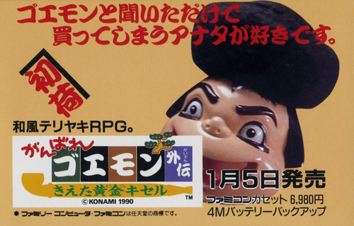 がんばれゴエモン外伝 きえた黄金キセルは、1990年1月5日にコナミから発売されたファミリーコンピュータ用ソフト。長旅を終え、久々に「はぐれ町」に帰ってきた天下の義賊ゴエモン。旅の報告も兼ねて自宅の神棚に向かってみると、大事に祀ってあったはずの先祖代々の家宝「黄金キセル」が消えていた。「泥棒の家が泥棒に入られた」という洒落にならない事態に直面し、急いで黄金キセルを探すための旅支度をしていた所に、「正義の忍者」を自称する謎の人物エビス丸が現れ、旅への同行を願い出てきた。かくして、家宝の黄金キセルを探す長い旅が始まった…。