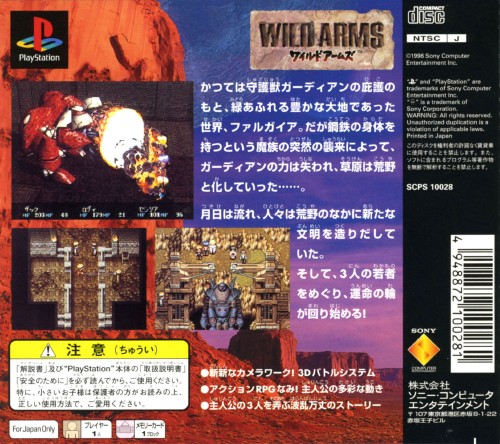 ワイルドアームズ(WILD ARMS)はソニー・コンピュータエンタテインメントから1996年12月20日に発売プレイステーション用ソフトでRPG。基本はオーソドックスなターンバトルだが、独自要素も多い。ターンごとに上記のガーディアンを含む装備を変更することが出来るなど、戦術的な幅は広い。大昔に全滅したと思われていた魔族が復活し、滅ぼされつつある惑星ファルガイアを守るために、ロディ、ザック、セシリアの3人が魔族と戦う物語。