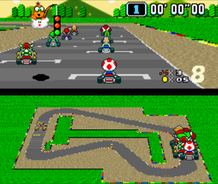 スーパーマリオカート(Super Mario Kart)は、任天堂が1992年8月27日に発売したスーパーファミコン用ソフト。マリオカートシリーズの1作目。日本国内でのスーパーファミコン用ソフトの最高売り上げを記録した。モードは4つに大別され、カップ毎に5つのコースでレースを行って上位4位が獲得できる「ドライバーズポイント」を稼いでカップ獲得を目指す「マリオカートGP」、敵カートからの妨害を受けることなく自らの限界タイムに挑める「タイムアタック」、そして対人要素として既存のコースをひとつ選びタイムを競う「VSマッチレース」、専用コースでお互いのカートにアイテム攻撃を仕掛けて先に相手カートに付けられた風船を3つ割ることを目的とする「バトルゲーム」が用意されている。4タイプ8人のキャラクターの中から好きなドライバーが選べる。キャラクターごとに最高速度、加速力、コーナリング性能などが異なる。